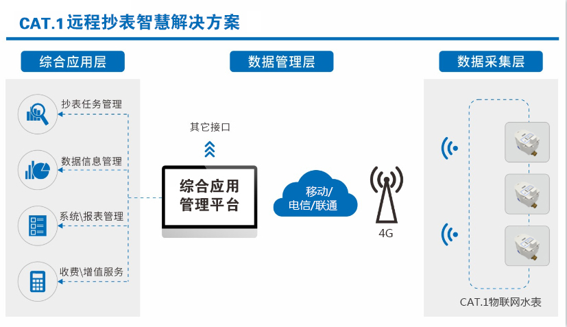 CAT.1物聯(lián)網(wǎng)水表是一款用于遠(yuǎn)程抄表及制控的智能水表。它通過(guò)4G服務(wù)器進(jìn)行遠(yuǎn)程通訊,無(wú)需中間傳輸設(shè)備,簡(jiǎn)化了設(shè)備安裝與布線工作,實(shí)現(xiàn)了水表自動(dòng)遠(yuǎn)程抄表,有效避免了管理部門(mén)上門(mén)抄表的人力工作,具備閥門(mén)控制功能,方便管理部門(mén)對(duì)水表使用情況進(jìn)行控制。每個(gè)水表都作為一個(gè)終端獨(dú)立工作,維護(hù)簡(jiǎn)單,工作運(yùn)行可靠。結(jié)構(gòu)緊湊防護(hù)等級(jí)可達(dá)IP68,適用于各種環(huán)境無(wú)需調(diào)試,即裝即用,PC端和手機(jī)均支持,可滿足不同客戶管理需要,可設(shè)置告警用水 、透支水量等。水費(fèi)計(jì)算滿足多種需求可細(xì)分為階梯、非階梯水價(jià)。廣泛應(yīng)用于中高端小區(qū)、別墅、學(xué)校、企業(yè)、工廠、公寓、水務(wù)等領(lǐng)域。