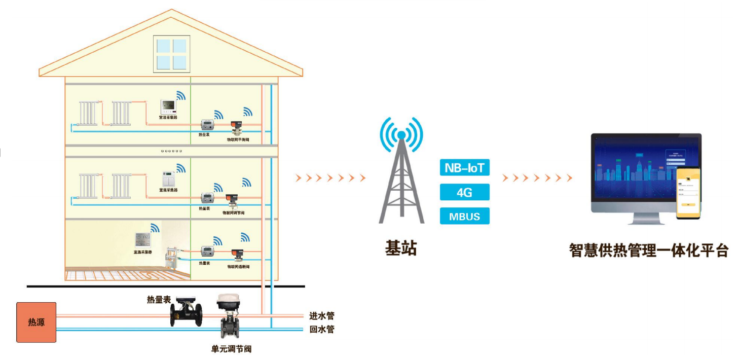 1. 全域感知(IoT): 在樓宇熱力入口、單元管道井及用戶室內部署溫濕度、壓力、流量傳感器,構建起覆蓋“源-網-站-戶”的全鏈條數據感知網絡。